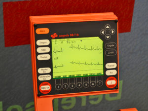 Monitoreinheit mit halbautomatischer Defibrillator-Funtion. Anzeige von Sauerstoffsättigung im Blut und Ableitung eines Elektrokardiogrammes (EKG).