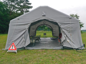 Luftkammerzelt als Bestandteil einer mobilen Unfallhilfsstelle für den schnellen Aufbau bei Großschadenslagen.
